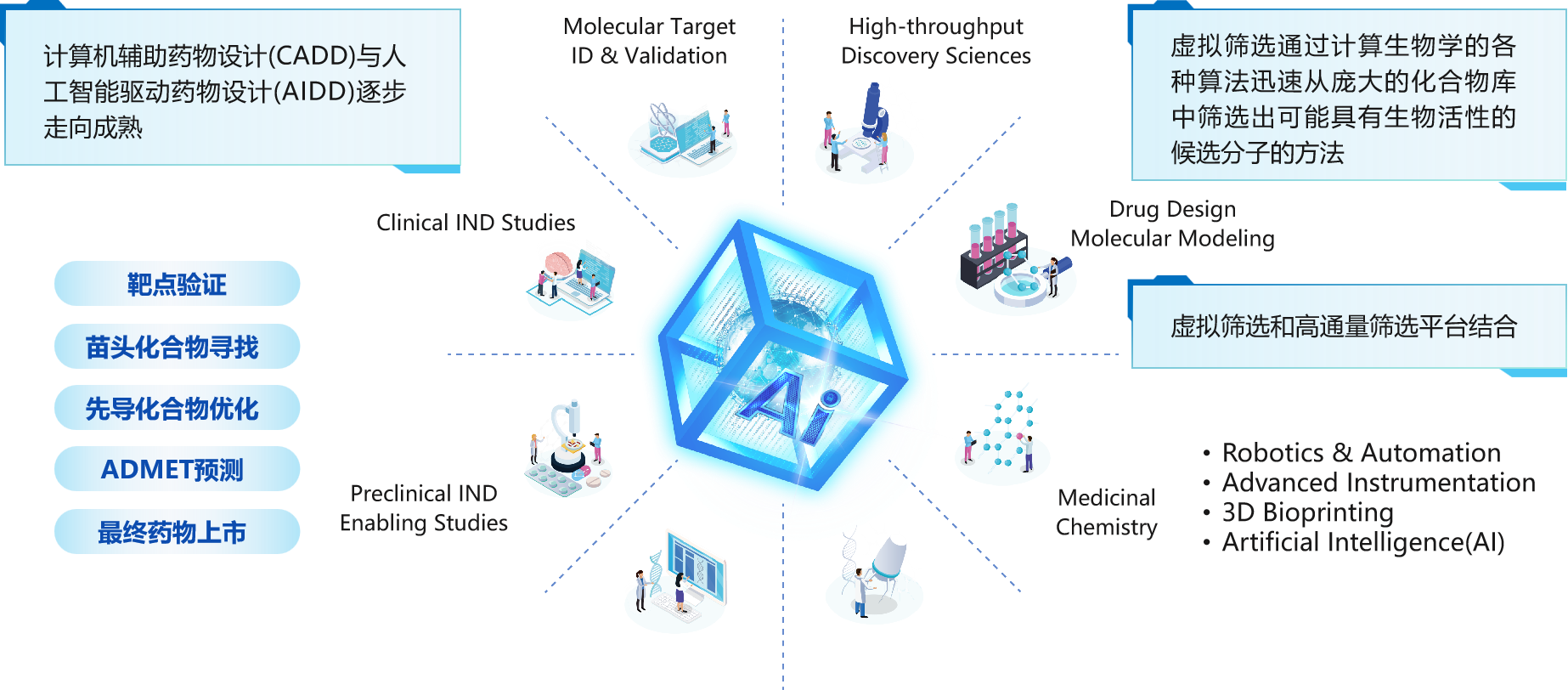 虚拟筛选是一种基于计算机技术、结构生物学和生物信息学等技术,通过计算生物学的各种算法迅速从庞大的化合物库中筛选出可能具有生物活性的候选分子的方法。随着算力指数级增长和AI技术的快速发展,计算机辅助药物设计(CADD)与人工智能驱动药物设计(AIDD)逐步走向成熟,其过程贯穿从靶点验证,苗头化合物寻找,先导化合物优化, ADMET预测,到最终药物上市的多个环节。