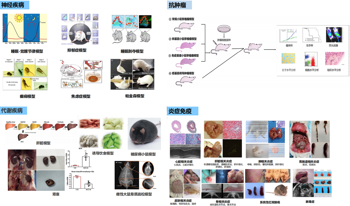 动物疾病模型和药效测试 平台专注于肿瘤、神经系统性疾病、代谢性疾病、炎症和自身免疫性疾病模型构建和药效测试,支持开展靶点验证、药效研究,药理机制研究、生物标志物发现、药代动力学研究、简单毒理研究等方面。